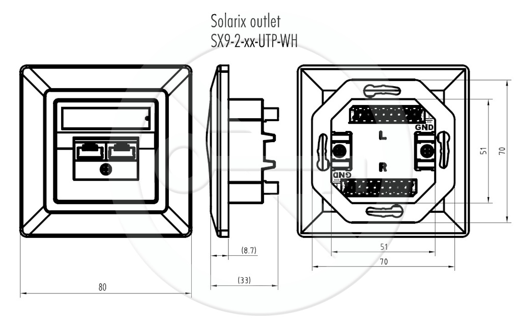 Zásuvky SX9 z produktové skupiny Solarix – kategorie 6 bez problémů splňují všechny požadavky definované ve standardech pro strukturovanou kabeláž ANSI/TIA 568, ISO/IEC 11801 a EN 50173 pro kategorii 6 a třídu vedení Class E, včetně všech nejnovějších dodatků. Zásuvky jsou typu German style a jsou osazeny jedním nebo dvěma porty RJ45 se sklonem 45°. Do IDC svorkovnice typu Krone lze zařezat vodiče typu drát o velikosti AWG 26 – 22. Kontakty jsou na svorkovnici označeny barevným schématem podle typu zapojení, a to buď podle standardu T568A, nebo T568B. Zásuvky SX9 jsou zkonstruovány tak, aby poskytovaly maximální výkon, dlouhou životnost, spolehlivost a zároveň umožňovaly jednoduchou instalaci. Zásuvky jsou dostupné jak v nestíněné, tak stíněné verzi a jsou určeny k instalaci pod omítku nebo do parapetních žlabů. Při použití boxu SX9-0-WH lze tento typ zásuvky použít k instalaci na omítku. Barva zásuvky i boxu je bílá (RAL 9003).