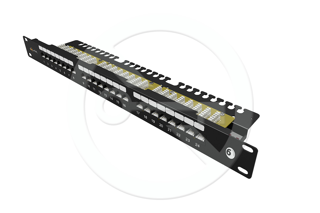 Nestíněný patch panel CAT6 24 portů s vyvazovací lištou, černý.