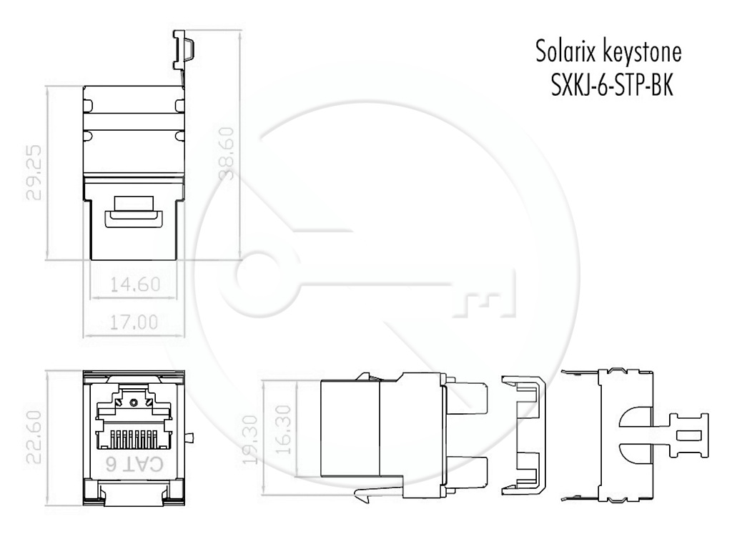 Zařezávací keystony produktové řady Solarix – kategorie 6 jsou dodávány jak v nestíněném, tak i ve stíněném provedení. Standardní barva u nestíněného keystonu je černá; v případě stíněného keystonu je tělo modulu opatřeno stříbrnou kovovou částí. Oba tyto typy keystonů převyšují požadavky definované ve standardech ANSI/TIA 568, ISO/IEC 11801 a EN 50173 pro kategorii 6 a třídu vedení Class E, včetně všech nejnovějších dodatků. Zařezávací keystony Solarix nabízí vysokou spolehlivost, maximální funkčnost a jednoduchou instalaci. Kontakty duální svorkovnice typu 110/Krone jsou označeny barevným schématem podle způsobu zapojení, a to buď podle standardu T568A, nebo T568B. Do svorkovnice lze zařezat kabely typu drát s vodiči o velikosti AWG 26 – 22. Pro pohodlné a bezpečné zařezávání keystonů je k dispozici montážní držák SXKJ-MD-BU určený k zafixování keystonu na pracovní ploše (tj. při zařezávání není nutné držet keystone přímo v ruce). Díky svým kompaktním rozměrům jsou tyto zařezávací keystony kompatibilní s modulárními zásuvkami většiny výrobců (např. ABB, Schneider, Legrand, Moeller, Hager, Obzor atd.). Tuto kompatibilitu si můžete ověřit v tabulce kompatibility, která se nachází v souborech ke stažení.