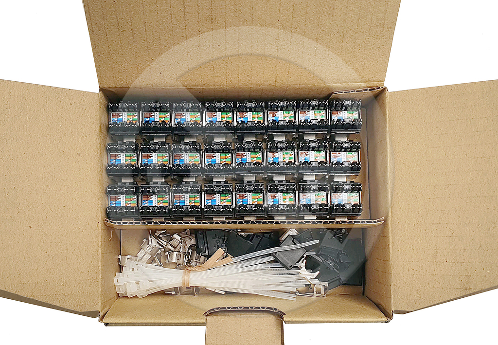 Balení 24 ks, rychlozařezávací stíněný keystone CAT6A RJ45 s Component Level a 4PPoE certifikací.