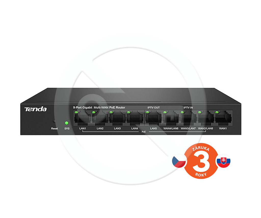 Tenda G0-8G-PoE Gigabit PoE Router je univerzální router včetně PoE switche. MultiWAN, 9x Gigabit RJ45 (3x WAN/LAN, 1x WAN, 5x LAN), 8x LAN PoE+ 802.3 af/at, celkem 95W. Podporuje management až 128x WiFi AP Tenda i21, i24, i25, i27, i29, a dalších. Fast Roaming IEEE 802.11k/v/r, VPN IPSec, PPTP, L2TP, Smart Bandwidth control, DHCP server.