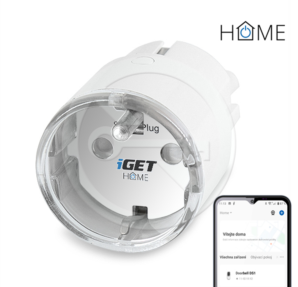 Chytrá zásuvka ovládaná přes WiFi, kompatibilní s aplikací iGET HOME, Google Assistant a Amazon Alexa, měření spotřeby energie, max. zatížení 3680 W, aplikace pro Android a iOS zdarma v češtině, nastavení časovačů, statistiky.
