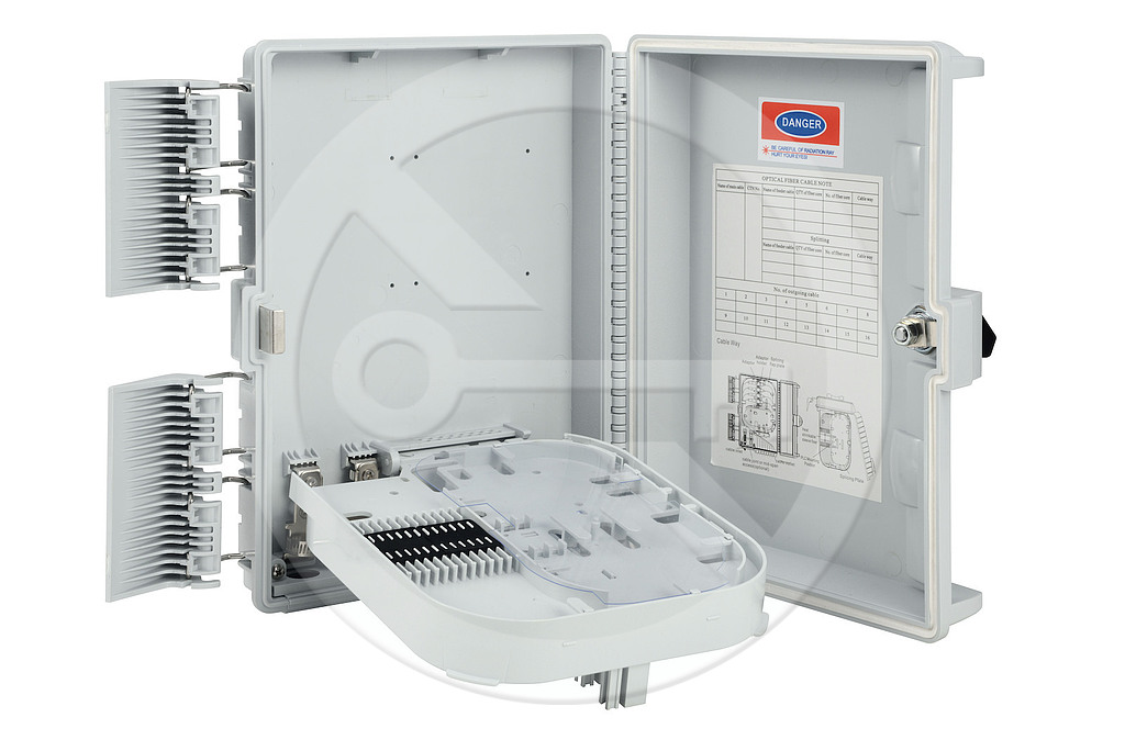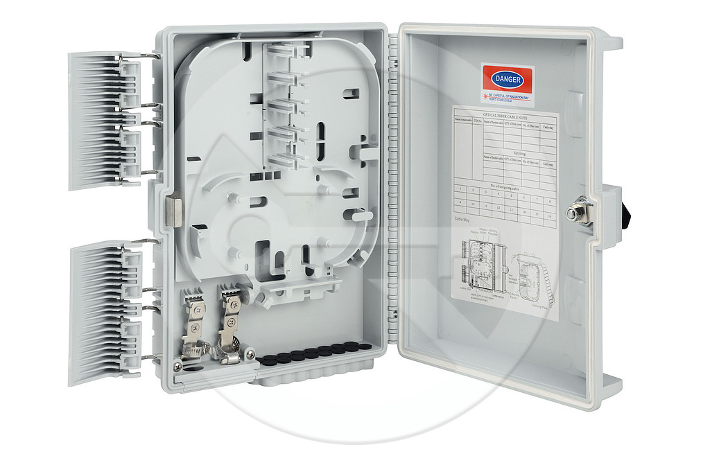 Optický nástěnný box slouží k ukončení optických kabelů ve venkovních i vnitřních instalací. Tento optický box se vyznačuje vysokým stupněm krytí IP65. Povrch optického nástěnného boxu je UV odolný. Je možno jej upevnit na sloup nebo za pomocí montážní sady přímo na zeď. Optický box umožňuje ukončit až 16 vláken v kombinaci adaptérů 16xSC simplex nebo 16xLC duplex, popřípadě 16xE2000. Obsahuje 2x vstup pro optické kabely s gumovou krytkou v provedení mid-span tzn., že je možné ukončit i průběžně instalovaný kabel bez nutnosti přerušení všech vláken v kabelovém svazku. Výstup disponuje 16-ti otvory pro patch kabely, které jsou opatřeny gumou krytkou. Při umístění optického patch kabelu do boxu je nutno naříznout podélně gumovou krytku a zatáhnout ji zpět společně s patch kabelem do otvoru optického boxu. Součástí optického boxu je i horizontální vyklápěcí dno, zajišťující snadnější manipulaci při ukončení a vyvázání pigtailů. Samotný box je uzamykatelný.