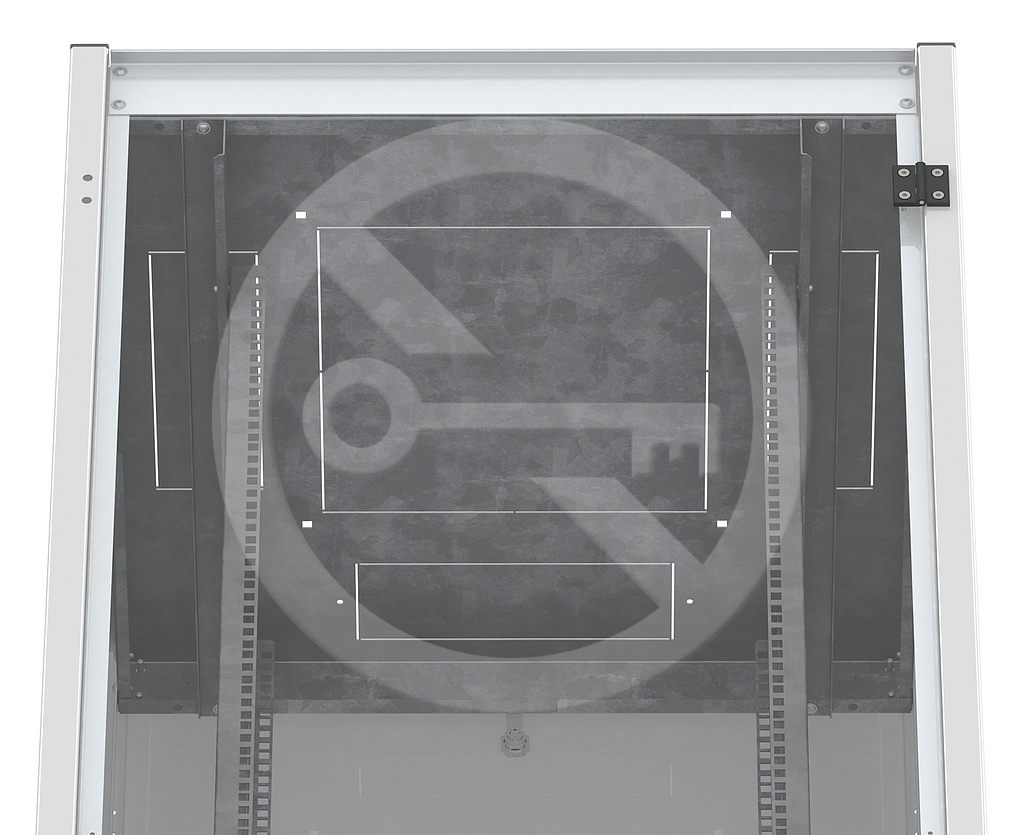 Z čelní strany je rozvaděč osazen celoskleněnými dveřmi z čirého kaleného bezpečnostního skla (EN 12150-1). Dveře mají max. úhel otevření 180° a jsou osazeny cylindrickým zámkem s jednobodovým zamykáním.