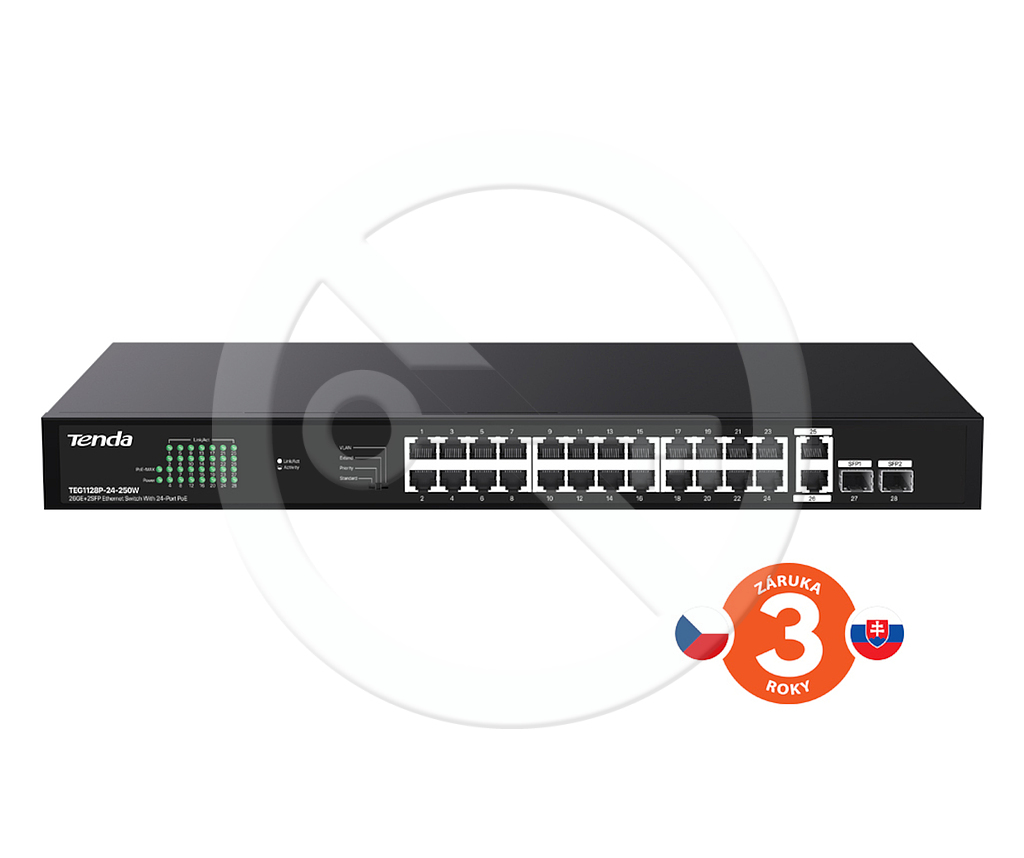 Tenda TEG1128P-24-250W přepíná data pomocí 26ti portů RJ45 a 2x SFP slotů, 24 portů 10/100/1000 Mb/s podporuje PoE802.3af/at. Switch má ochranu proti přepětí 6kV. Podpora přepojování uzlů v módu Store-and-Forward. Full-duplex kontrola toku 802.3x, half-duplex kontrola toku v režimu Back-Pressure.