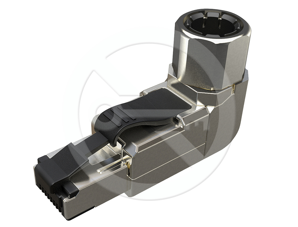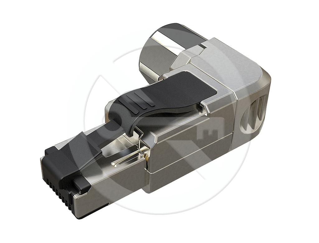 Vysoce kvalitní samořezný úhlový konektor RJ45 CAT5E pro vodič typu drát i licna vhodný pro STP kabeláž.