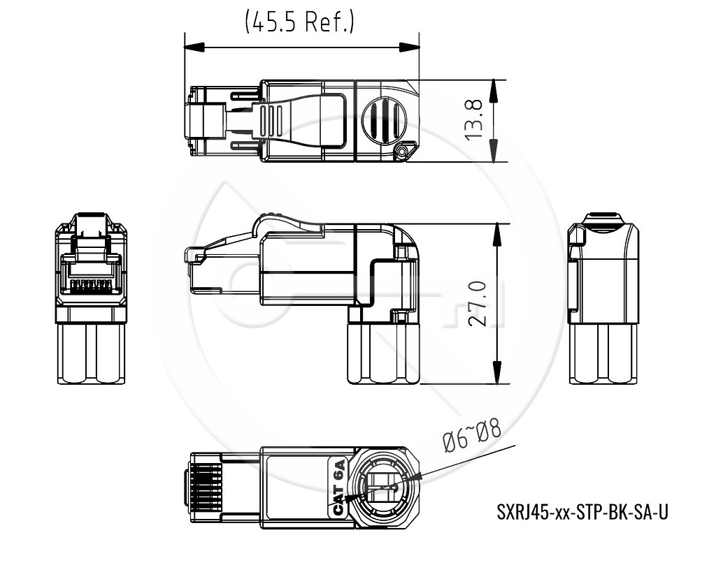 Samořezný úhlový konektor Solarix s označením SXRJ45-5E-STP-BK-SA-U je univerzální průmyslový konektor RJ45, který je určen pro kabely typu drát i licna a je vhodný i pro použití v MPTL (Modular Plug Terminated Link) topologii. Vyznačuje se snadnou a rychlou instalací, ke které nejsou potřeba krimpovací kleště. Vysoká spolehlivost a robustní kovové provedení tohoto konektoru umožňuje jeho použití i v náročných podmínkách. Tento konektor Solarix bez problémů splňuje všechny požadavky definované v mezinárodních standardech ANSI/TIA 568, ISO/IEC 11801 a EN 50173 pro kategorii 5E a třídu vedení Class D, včetně všech nejnovějších dodatků. Samořezný konektor Solarix kategorie 5E lze použít k zakončení kabelů s celkovým průměrem od 6,00 mm až do 8,0 mm s vodiči AWG 26-23 až do průměru 1,50 mm (včetně PE izolace). Výhodou je možnost nasměrování zakončeného kabelu do 4 různých stran pod úhlem 90° (tj. nahoru, dolů, doleva a doprava).